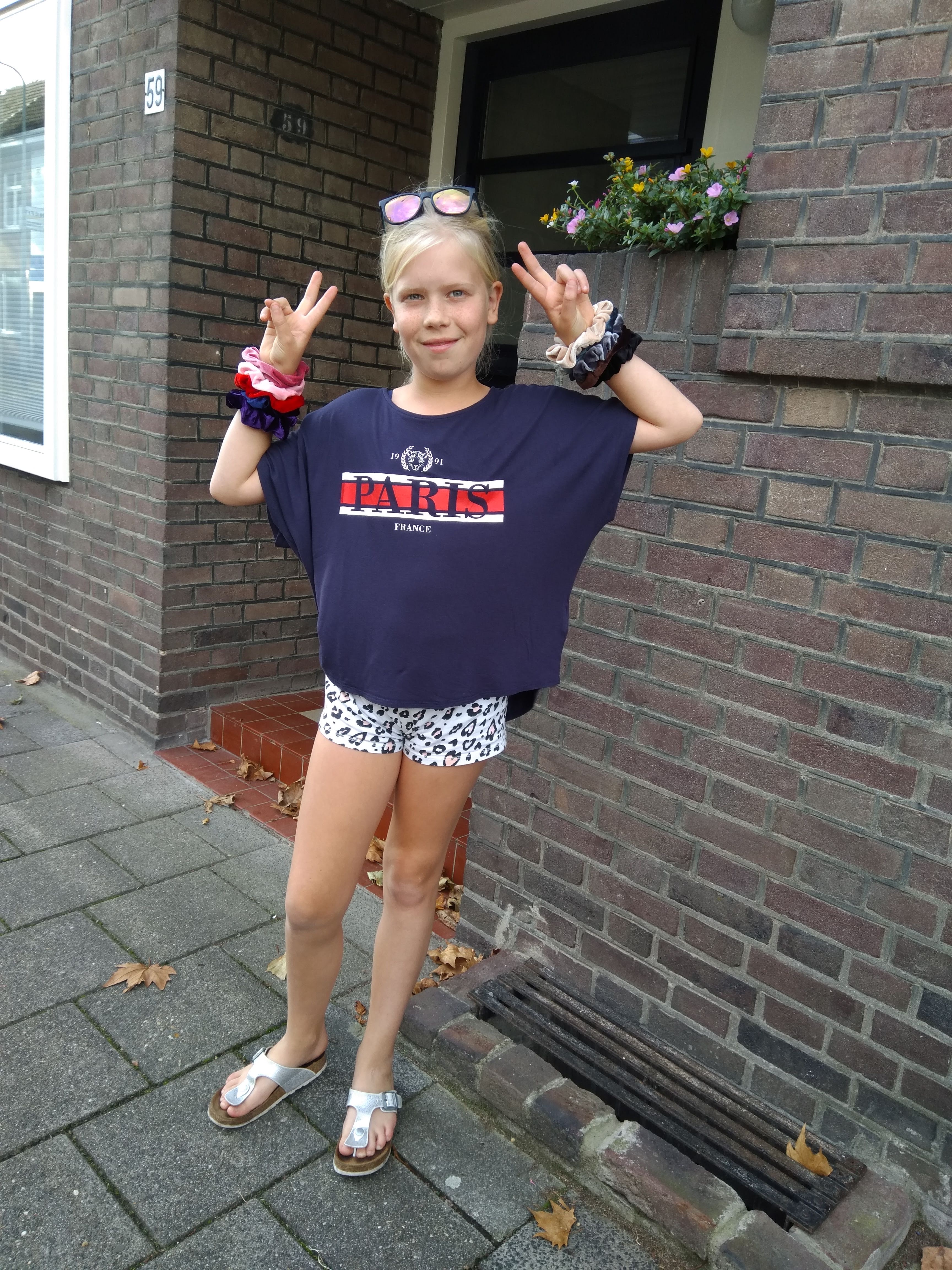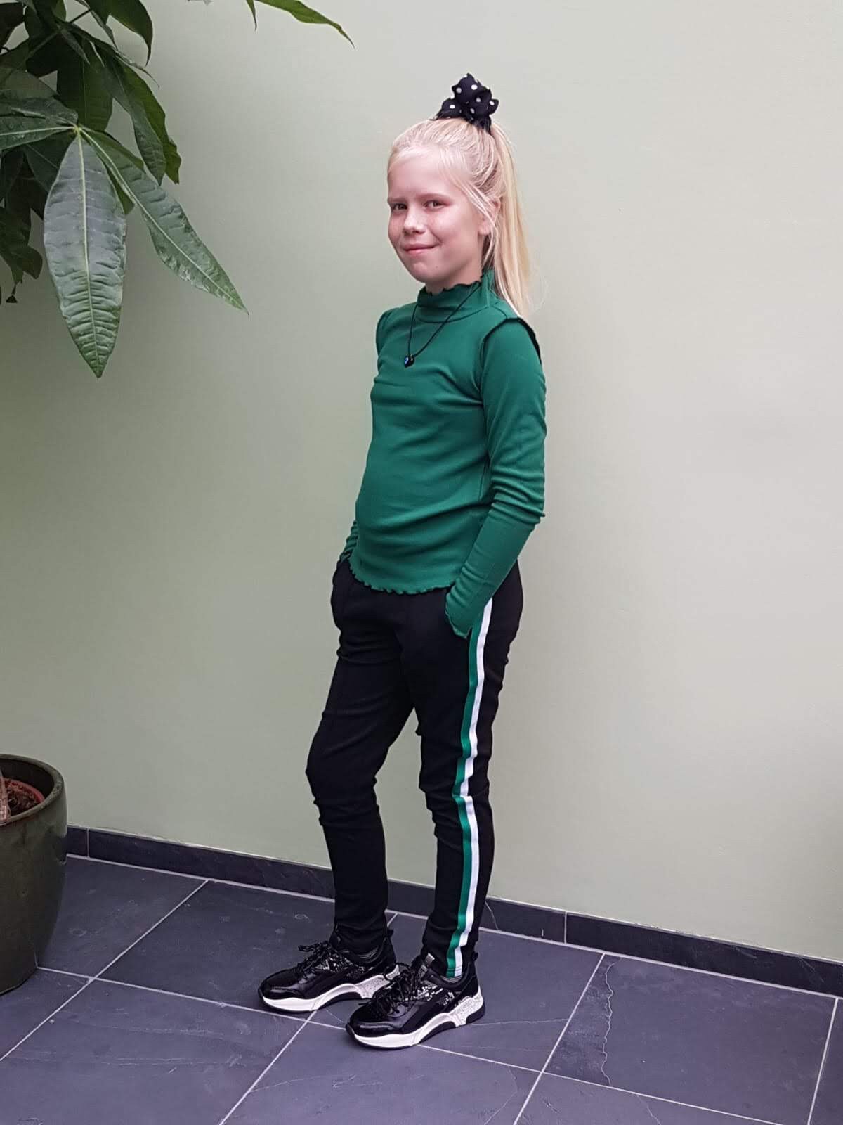 Deze kleding heb ik van mijn tante gekregen. De broek en de trui zitten heel lekker. De scrunchie met stippen staat heel leuk bij de schoenen.